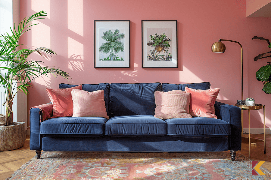 Granatowa kanapa na tle koralowej ściany