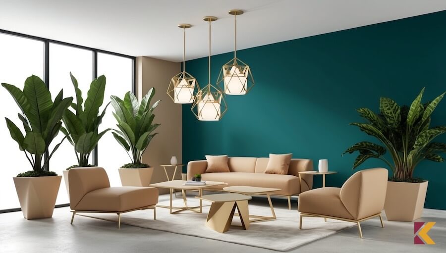 Salon, kremowe fotele i sofa, ściana akcentowa w kolorze petrol