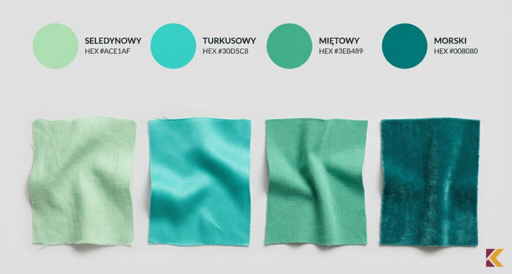 W tej grupie kolorystycznej często mylony jest również miętowy, który jest „świeższy” i bardziej błękitny od seledynu, ale jaśniejszy i mniej nasycony niż turkus, oraz morski, będący głębszym wariantem leżącym na granicy ciemnej zieleni i granatu. Kluczem do identyfikacji jest więc dominanta: seledyn zawsze pozostaje w sferze bladej zieleni, podczas gdy turkus i mięta wyraźnie ciążą ku chłodnym błękitom.