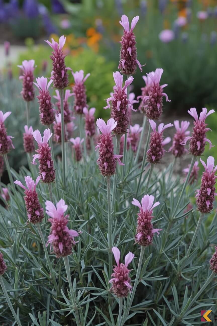 Lawenda francuska (Lavandula stoechas) wyróżnia się kwiatostanami z barwnymi „piórkami” u szczytu i szeroką gamą barw od fioletów po biele i bordo. W polskich warunkach jest wrażliwsza na mróz, dlatego zwykle uprawia się ją w pojemnikach, które na zimę trafiają do chłodnego, jasnego miejsca. To dobry wybór, gdy priorytetem jest efekt dekoracyjny w donicach, skrzynkach i przy wejściu do domu.